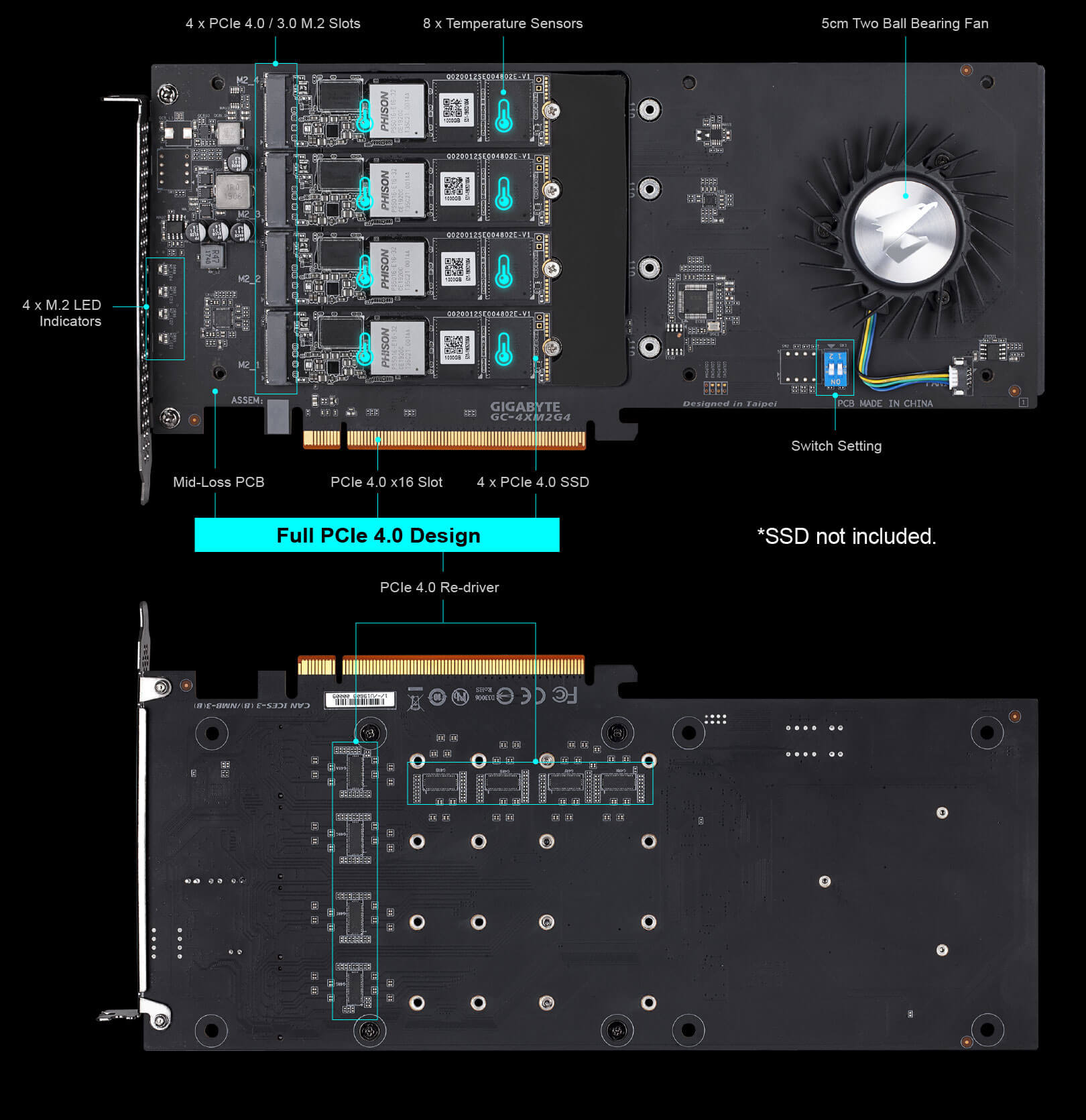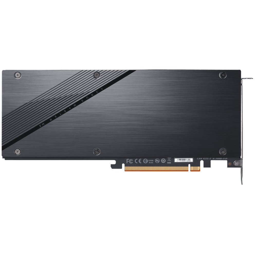 | Advanced Thermal Solution AORUS Gen4 AIC Adaptor equips very advanced thermal solution, including 5.5mm pure copper heatsink, 5cm double ball bearing fan, M.2 SSD baseplate and multiple thermal pads to cool down both sides of 4 M.2 high performance SSD with active cooling. Users can choose 3 different fan profile based on hardware configuration to reach perfect balance of high storage performance and low noise. |
