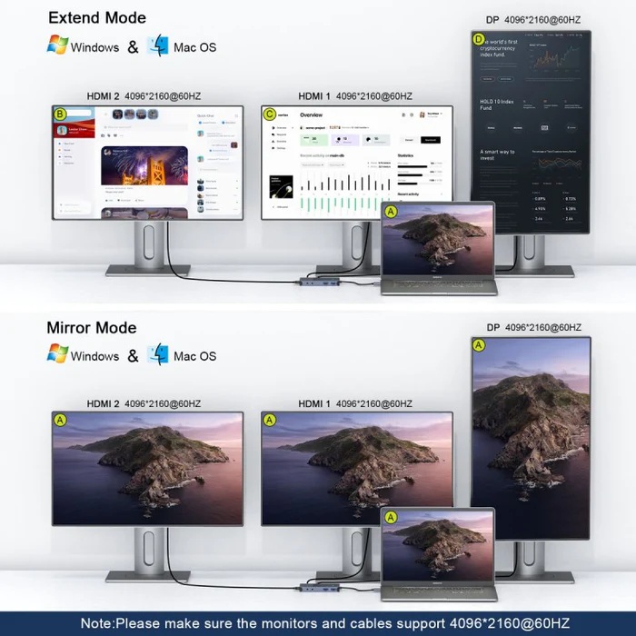 Dual 4K USB C Hub:QGeeM USB Dock built-in HDMI and DP outputs each supporting 4096*2160@60Hz. When using two monitors,HDMI 1port always on display(HDMI1+HDMI2 / HDMI1+DP support up to 4K@60Hz ). Multi display can set mirror,extend and main display rouad mode for Windows & Mac, extend mode is no longer limited by the Mac OS.The USB C Hub makes your work more efficient.