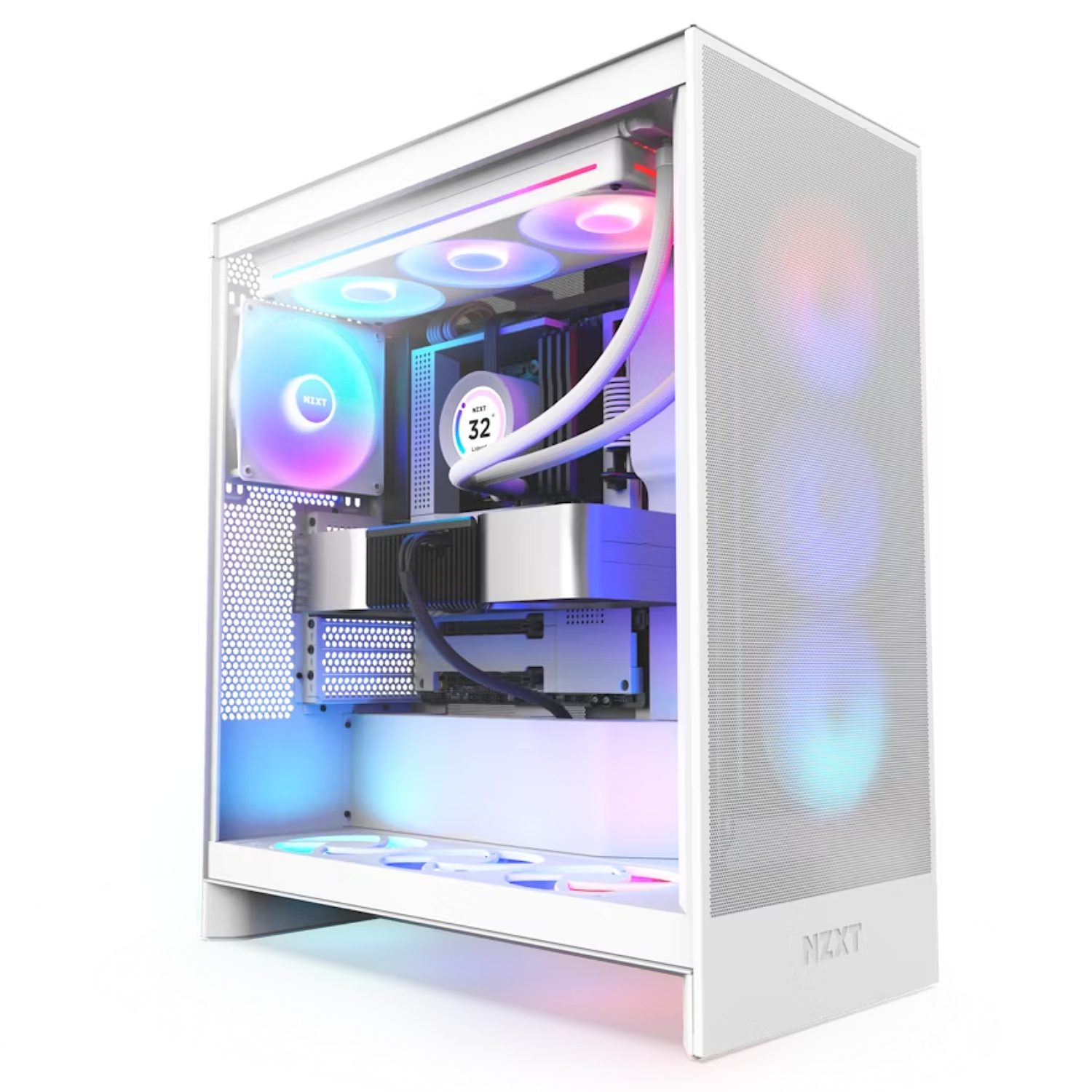 NZXT H7 Flow RGB Mid-Tower ATX Case White revolutionizes GPU cooling in a classic mid-tower form factor. Its vertical PSU layout allows space for 3 x 120mm bottom fans, offering efficient cooling without expanding the case footprint. CM-H72FW-R1